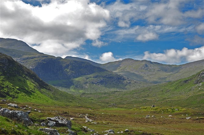 Hoge bergen waar je tussendoor gaat.