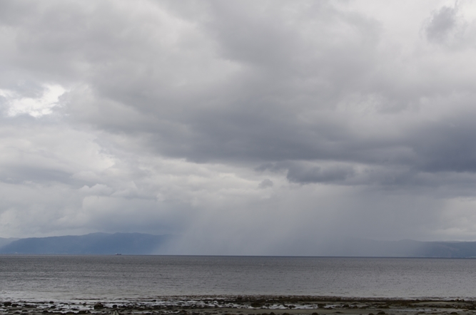 Tijdens het ritje naar de supermarkt komt er een buitje aan.