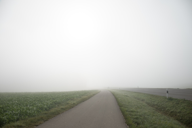 Mistig begin van de dag. Pas om een uur of 10 trekt het langzaam open. Licht golvend landschap. Niet spectaculair.