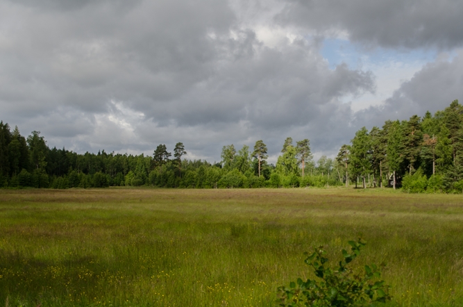 Vänersborg uit en een bospad op. Het slingert alle kanten op, maar uiteindelijk kom ik weer op een verharde weg uit. Deze weg ligt zover bij het meer vandaan, dat ik geen water zie.