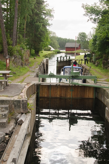 Een klein sluisje van het ene meer naar het andere. Maar dit is de sluis niet waar ik heen op weg ben.