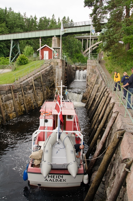 Spectaculair. Hat water kolkt als een razende rivier de sluis in. Als het water boven de drempel staat, moet de boot, tegen de stroom in, naar het tweede vak worden getrokken.