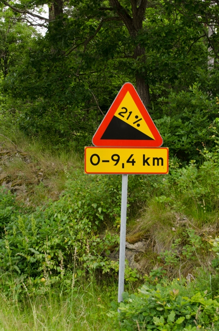 Ik rijdt het dorp uit en zie een waarschuwingsbord dat er, over de komende 9 kilometer, stijgingen van 21% voorkomen.