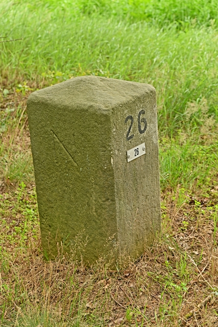 De Grens bestaat die dag voor een groot deel uit een oude Romeinse weg. Dat had ik hier nier verwacht. Gelukkig staan de grenspalen aan de goede kant van de weg, maar een enkele staat ineens aan de verkeerde kant. Loopt de weg nu ineens aan de andere kant van de weg en ben ik in Duitsland? Duidelijk wordt het niet als de volgend grenspaal weer netjes aan de goede kant staat. Even verderop staat er aan iedere kant van de weg een grenspaal. Opluchting, vermoedelijk loopt de grens op het midden van de weg.
