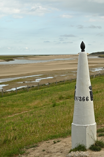 De laatste grenspaal. De grens loopt ergen in het Zwin, het water op de achtergrond. Deze grenspaal staat dus niet op De Grens. Maar de eerste grenspaal die ik zag, stond ook niet op De Grens. |